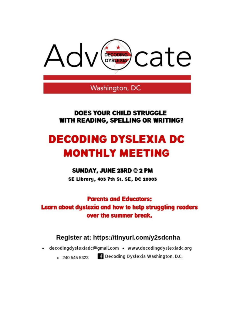 Decoding Dyslexia DC Monthly Meeting – June 23rd at 2pm