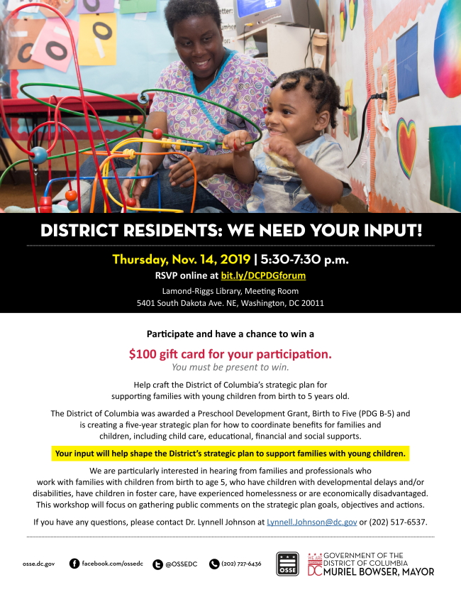 The Office of the State Superintendent of Education (OSSE) is soliciting input on the development of the District of Columbia’s Preschool Development Grant, Birth to Five (PDG B-5) five-year strategic plan. OSSE wants to hear from families with young children (birth through age 5), early childhood professionals, philanthropists, District government leaders, community leaders and other concerned citizens about the goals, objectives and actions for the strategic plan.