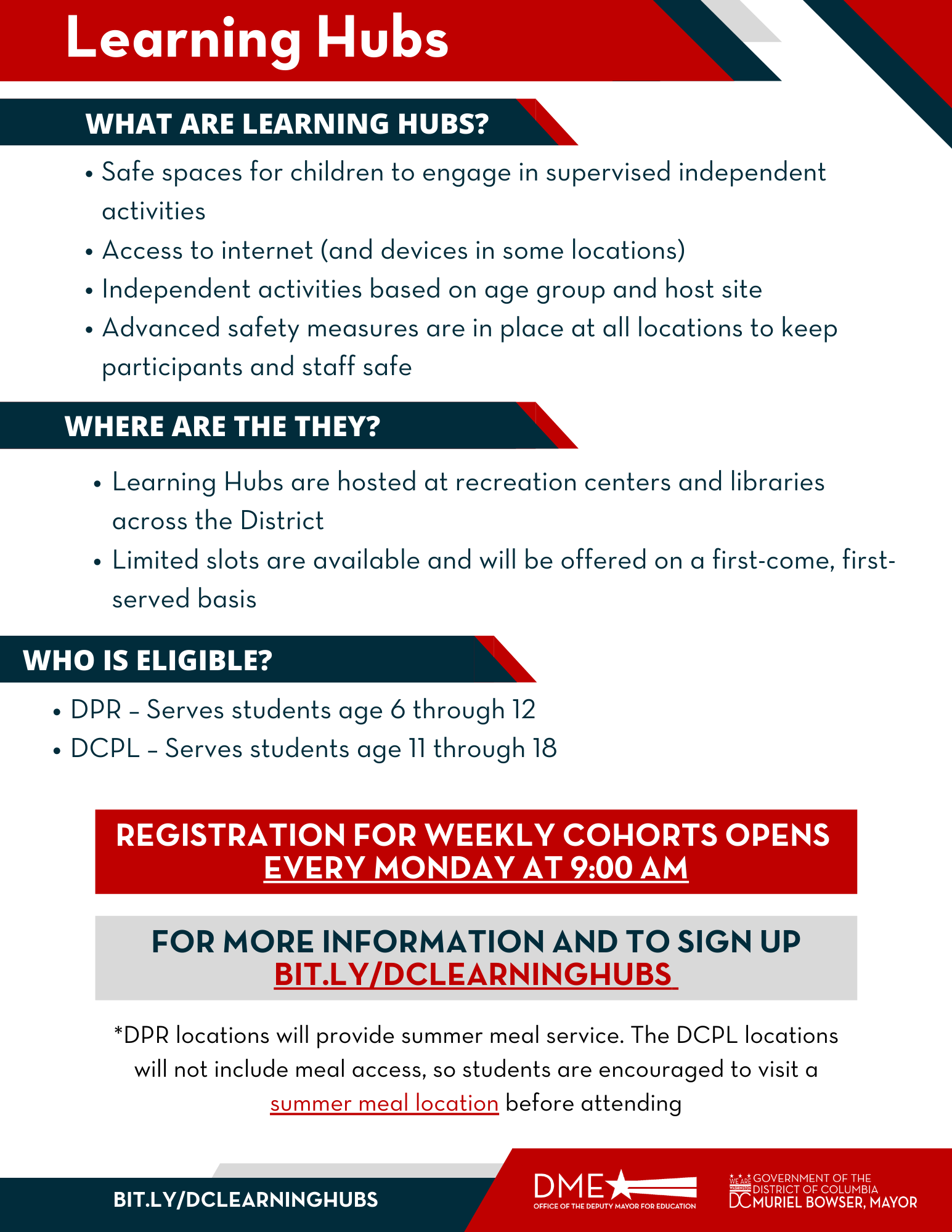 The District’s first Learning Hubs opened on Monday, June 29th. DPR Learning Hubs will serve students age 6 through 5th-grade students. DCPL Learning Hubs will serve rising 6th through 12th-grade students. For all locations, families who sign up will secure a seat for their child week-by-week.