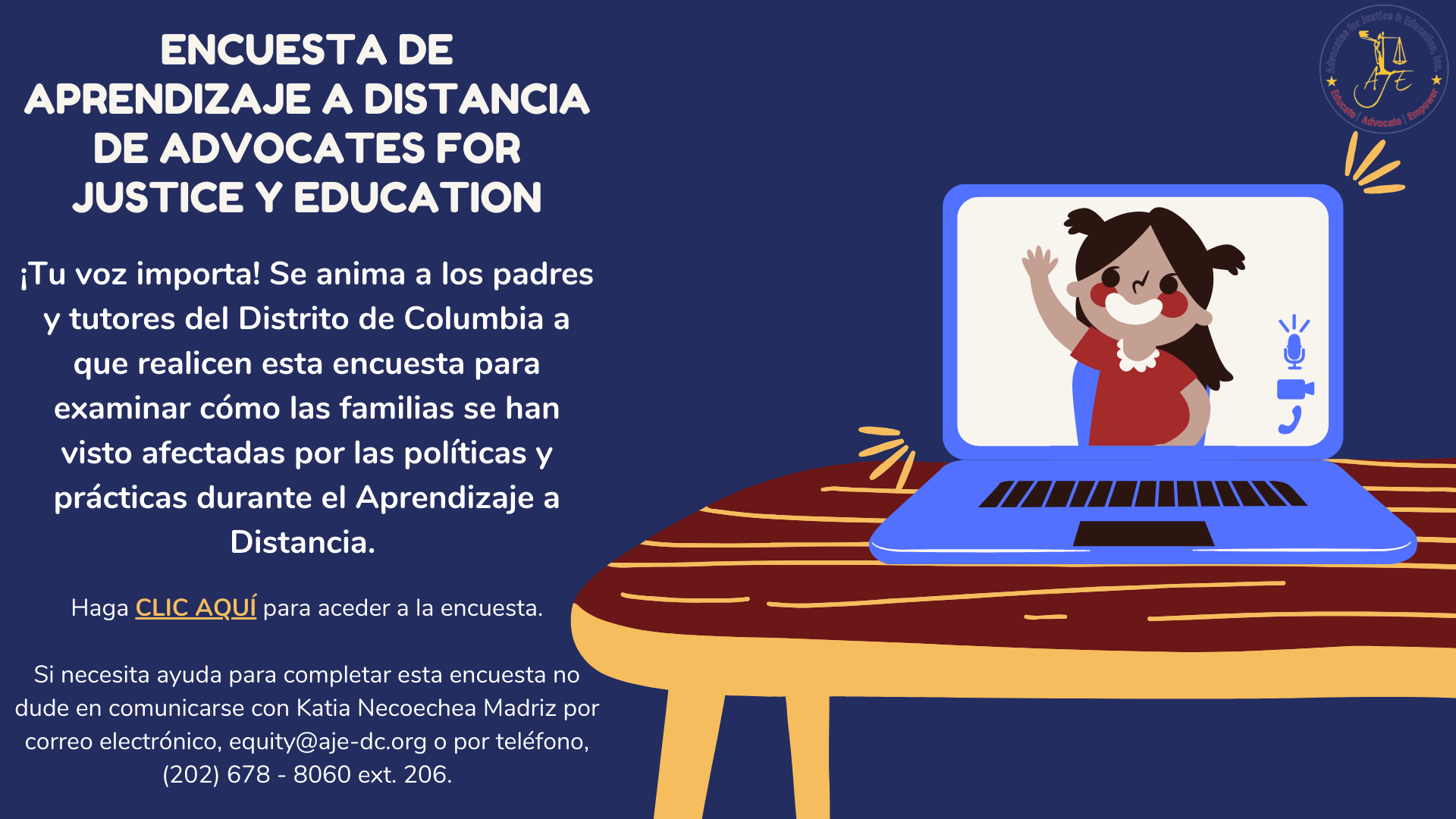 Advocates for Justice and Education, Inc. desea obtener más información sobre cómo el Aprendizaje a Distancia ha afectado a su familia. Lo invitamos a completar la Evaluación de Impacto del Aprendizaje a Distancia. El propósito de esta Evaluación de Impacto es evaluar cómo familias dentro del Distrito de Columbia han sido impactadas por las políticas y prácticas de Educación de Distancia. Esta evaluación, disponible en Inglés y Español, se utilizará para desarrollar un diálogo dirigido por las padres para abordar las políticas y prácticas identificadas aquí según las prioridades de los padres líderes. Si necesita quya para completar la encuesta, no dude en comunicarse con Katia Necoechea Madriz, por correo electrónico, equity@aje-dc.org o por teléfono, (202) 678 – 8060 ext. 206. Estamos ofreciendo tarjetas de regalo de Amazon de $25 a los primeros 50 padres verificados* que completen la encuesta.