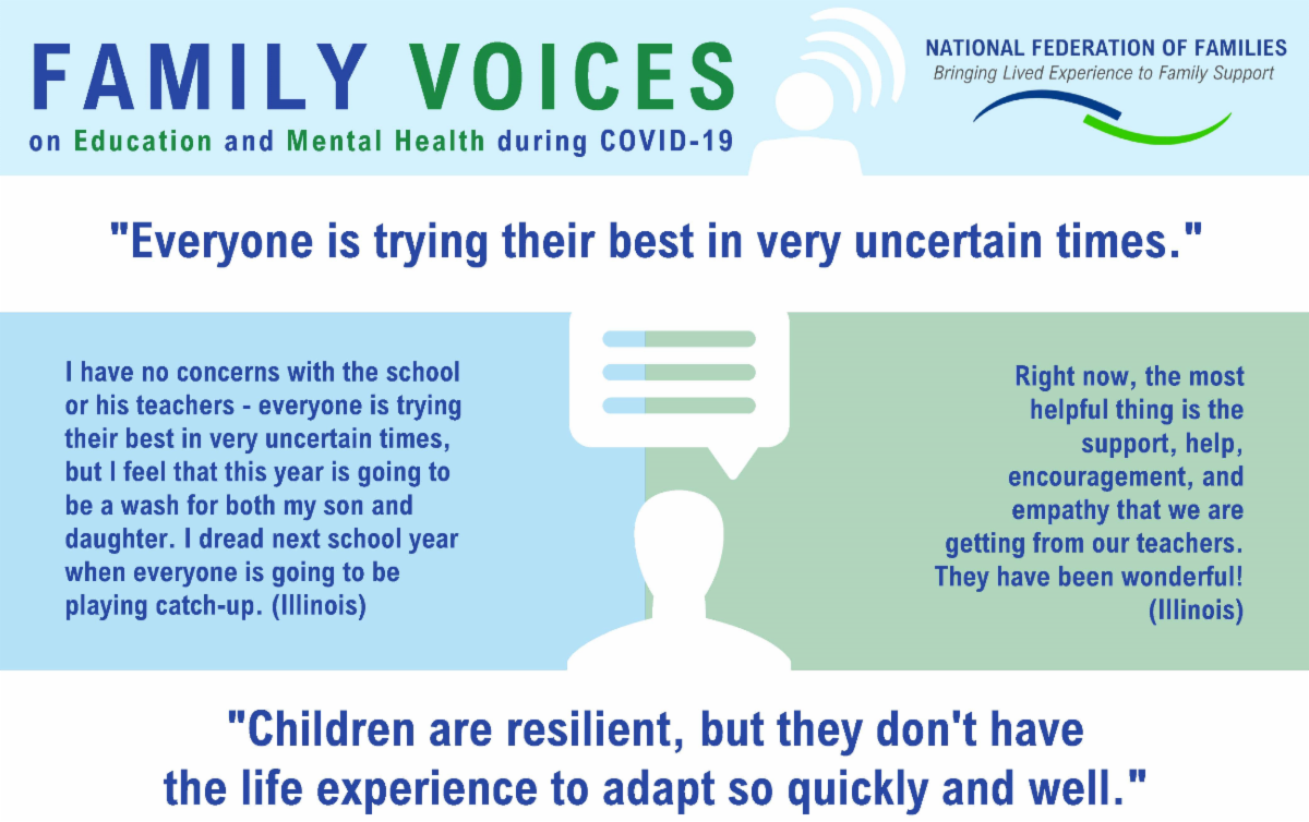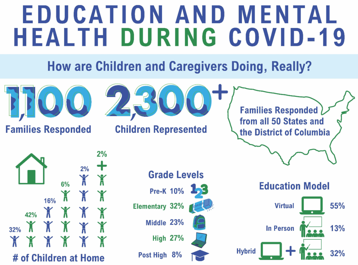 Over the past year, COVID 19 dramatically transformed every aspect of family life as stay-at-home orders went into effect nationwide. In January 2021, the National Federation of Families (NFF) conducted a national survey to learn from families regarding the effects of COVID 19 related to their children’s education and both their children and their family’s mental health. Receiving over 1100 responses from families in every state and the District of Columbia, NFF has compiled this data to create an infographic that offers a comprehensive look at the struggles our families face with both virtual education and behavioral health. Challenges range from balancing school and work, meeting students’ special education needs, and accessing needed behavioral health services. Both quantitative and qualitative data were collected, and these results will serve as the catalyst for the discussions in each webinar.