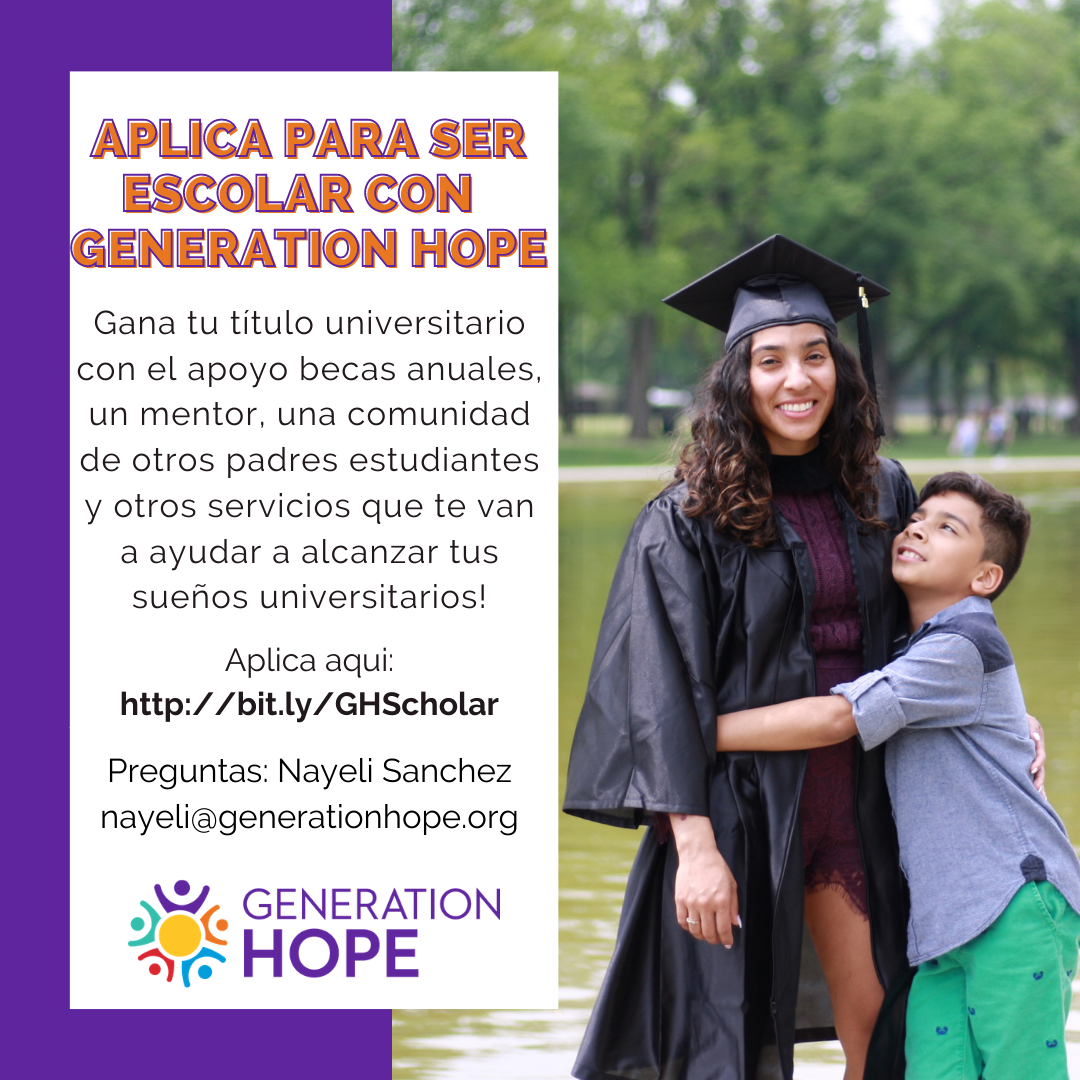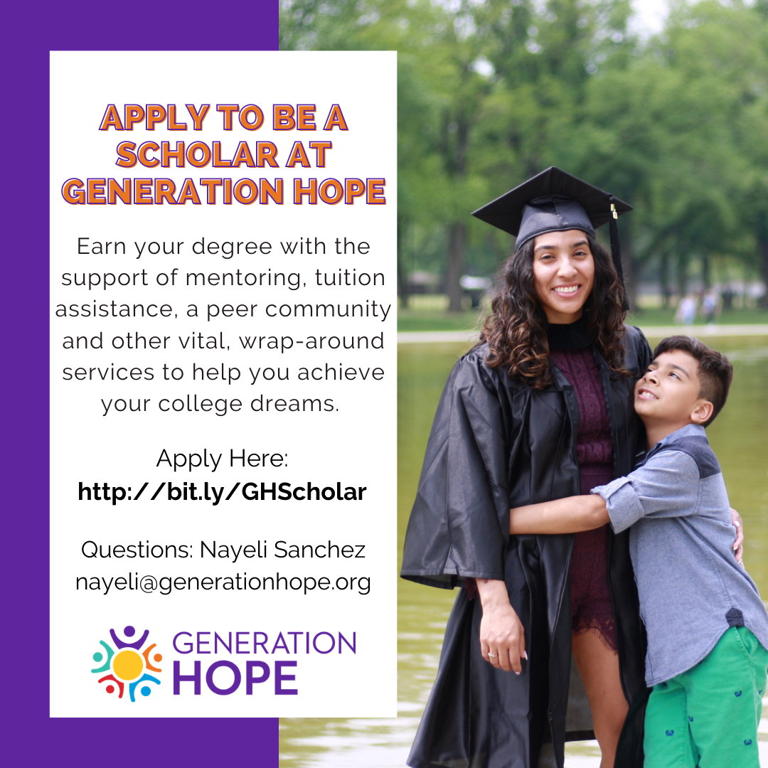 Generation Hope is a nonprofit organization that supports teen parents (moms and dads) in the DMV graduate from college through a variety of wrap-around services provided by our Scholar Program. Some of the benefits of their program include renewable scholarships of up to $2,400 per year, a dedicated mentor, case management, free mental health counseling and tutoring as well as access to an emergency fund, among many other supports.