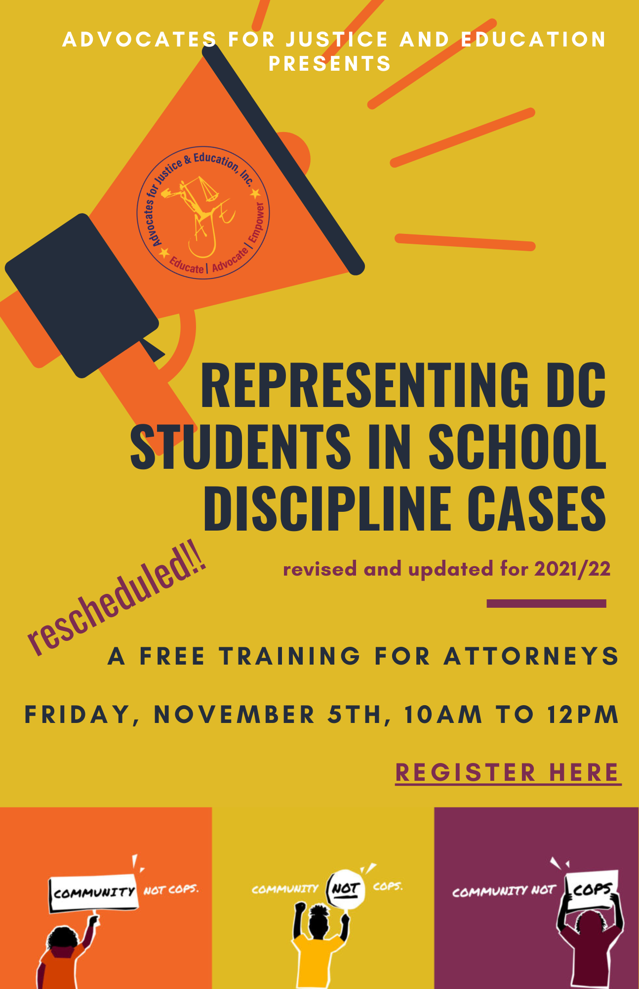 Did you register for the free training on REPRESENTING DC STUDENTS IN SCHOOL DISCIPLINE CASES? Were you disappointed when the training was canceled because of power outages? Well, it is back! The free training on Representing DC Students in School Discipline Case has been rescheduled!