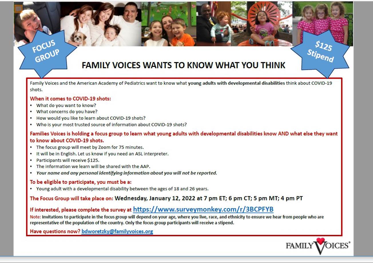 AJE wanted to share this great advocacy opportunity From Family Voices for young adults with developmental disabilities relating to the COVID shot.