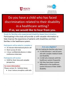 Paid Research Opportunity – University of Utah Study!0On March 31, 2022March 31, 2022By AJE-DCIn Blog, Custom, Events, NewsDid your child experience discrimination because of disability in a healthcare setting? The University of Utah would love to hear about your experience. See the flyer below for more details on this paid research opportunity.