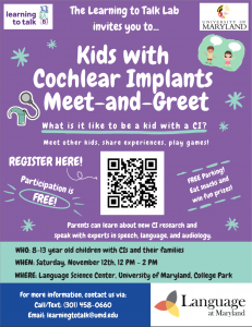 The University of Maryland is hosting a Kids with Cochlear Implants Meet-and-Greet on Saturday, November 12th from 12 to 2pm at the Language Science Center on the UMD campus (flyer below). The purpose of this event is to create a space for school-aged children with CIs (ages 8-13 years) to meet other children with CIs, share experiences, and make connections outside of school. The meet-and-greet will also include games and activities where children can earn fun prizes.