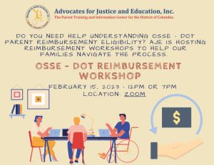 AJE is hosting two workshops on February 15th to help families complete the OSSE-DOT reimbursement forms.  This link is also  available here – https://us02web.zoom.us/meeting/register/tZUpd-qoqzwrEteT8QeFaI0d4u55CakokAid