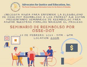 **ACTUALIZACIÓN**AJE está organizando dos talleres el 23 de febrero para ayudar a las familias a completar los formularios de reembolso OSSE-DOT**
