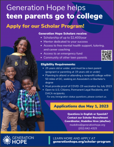 Parents accepted into Generation Hope’s program receive up to $2,400/year in scholarship funding, one-on-one mentoring, case management, free mental health support, career coaching, tutoring, and emergency funding as needed, and access to additional parenting support including free books, home visiting, and childcare assistance. To be eligible, applicants must have been pregnant or expecting at 19 or younger, currently be 25 or younger, live within 50 miles of DC, and be attending/planning to attend a nonprofit college seeking an associate’s and/or a bachelor’s degree. They also must be a US citizen, permanent legal resident, DACA recipient, or have any other status that provides work eligibility and in-state tuition (i.e. U Visa, VAWA, etc). The application and all of the program details are available at www.generationhope.org/