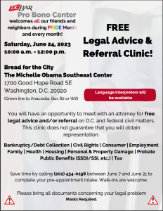 The D.C. Bar Pro Bono Center’s next Advice & Referral Clinic will take place on Saturday, June 24, 2023. Our clinic will operate IN-PERSON from 10:00 a.m. to 12:00 p.m and will be held at: