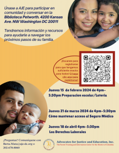 AJE is happy to announce a series of workshops designed to provide information and resources to families. Over the course of 3 workshops, will discuss information related to the school lottery system, maintaining health insurance, and workplace rights. If you are interested in joining us, register here or scan the QR code below.