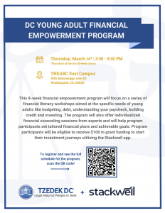 Tzedek DC is proud to announce that registration is now open for the second cohort of the Young Adult Financial Empowerment Program! T his 8-week program offers financial literacy workshops and free financial counseling to young adults in DC, as well as UDC students who live in DC, MD, or VA. These workshops are aimed at the specific needs of young adults, like budgeting, debt, understanding your paycheck, building credit and investing.