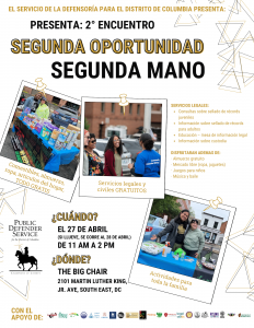 AJE invites families to join the 2nd annual Second Chance, Second Hand event coming up on Saturday, April 27th, 11am-2pm at the Big Chair. This event is in honor of Second Chance Month and is an opportunity for PDS, our neighbors, and community organizations to serve members of the East-of-the-River community where they are. With our legal partners, we are also providing services/resources for juvenile and adult record sealing, special education, immigration, benefits, housing, and custody. See flyer for more information and share with your networks!