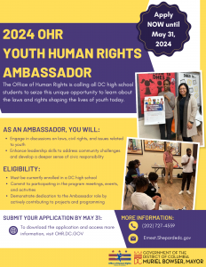 AJE would like to share with families The Office of Human Rights (OHR) – Youth Human Rights Ambassador Program. This program, tailored for DC high school students, offers a unique platform for developing leadership abilities, nurturing civic engagement, and offering valuable tools for our youth to facilitate dialogues on diverse youth-related community issues. Applications are being accepted until May 31, 2024. For further information on the program, please visit here or contact Ernest Shepard, OHR Youth Bullying Prevention Program Manager, at ernest.shepard@dc.gov
