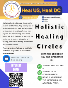 AJE would like to share with families Heal Us, Heal DC – Holistic Healing Circles. This is a family-focused healing collective that brings parents together who have experienced trauma from running up against barriers to accessing healthcare in DC, in navigating the special education process in DC, or both. We will get together to focus on clearing our minds to propel forward our dreams of a health conscious society that includes all of our families. If you’re interested, register: Holic Healing Interest Form. Our first virtual session starts this Thursday May 2nd. Looking forward to seeing you there!