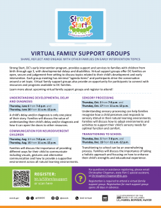 Strong Start Parent Support Groups – A virtual support group that offer DC families an open, secure and judgement-free setting to discuss topics related to their child’s development and early intervention. Each group meeting has minimal “agenda items” and participants drive the conversation around a set topic. Virtual family support groups also provide an opportunity for participants to connect with resources and programs available to DC families. Learn more below about upcoming virtual family support groups and register here or scan the flyer QR code to attend!