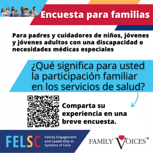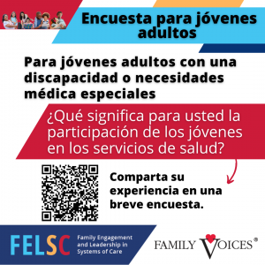 AJE le gustaría que las familias participaran en las encuestas de Family Voices para aprender más sobre lo que los jóvenes y las familias necesitan para sentirse involucrados en la transformación de la atención médica. Para acceder a las encuestas, haga clic en los enlaces a continuación o escanee el código QR de los folletos.
