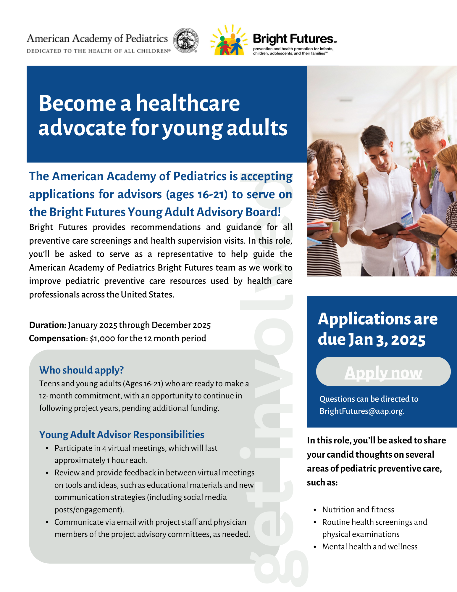 AJE would like to share that the American Academy of Pediatrics (AAP) is currently accepting applications for adolescent and young adult advisors (ages 16–21) to help inform updates to the Bright Futures Guidelines for Health Supervision of Infants, Children, and Adolescents, and related resources. Please see flyer below for more information. If interested, please apply online here. Applications are due Friday, January 3, 2025.