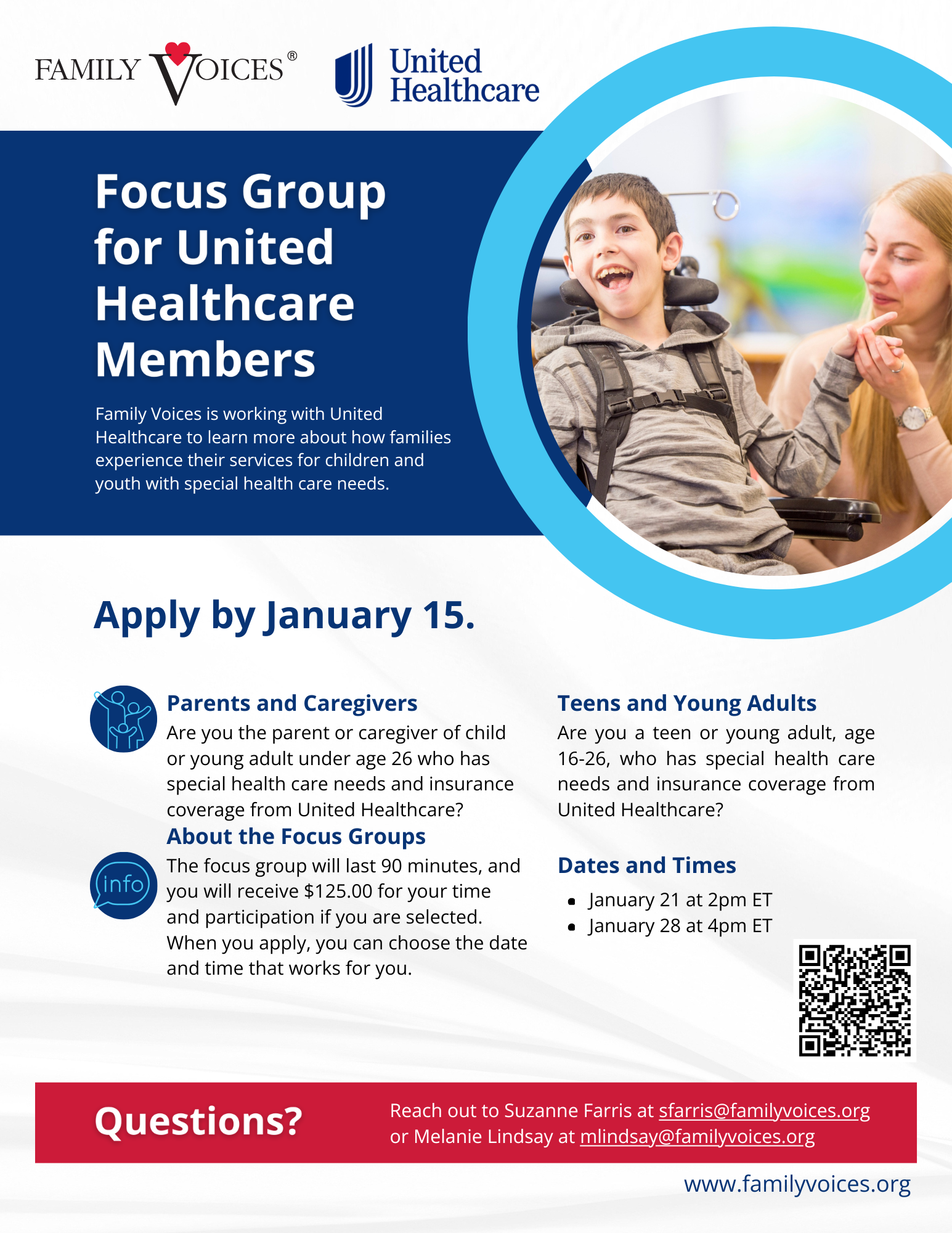 AJE would to share with our families that Family Voices will be hosting two family focus groups for United Healthcare members on January 21 at 2 PM ET and January 28 at 4 PM ET. These focus groups are open to United Healthcare members who are young adults (ages 16-26) with special health care needs, or parents/caregivers of a child or young adult under 26 with special health care needs. Each session will last 90 minutes, and accepted participants will receive $125. For more details, see the flyer below and click here to apply. The application deadline is January 15, 2025.