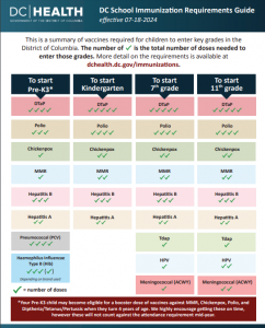 School-based Health Centers are available for families of children who are 3 years or older. Additionally, regardless of where your child is enrolled, a parent can seek vaccination-only appointments from a school-based health center. Don’t forget to call ahead and schedule an appointment. To find a list of school-based health centers find them at DC Health https://dchealth.dc.gov/service/school-based-health-centers