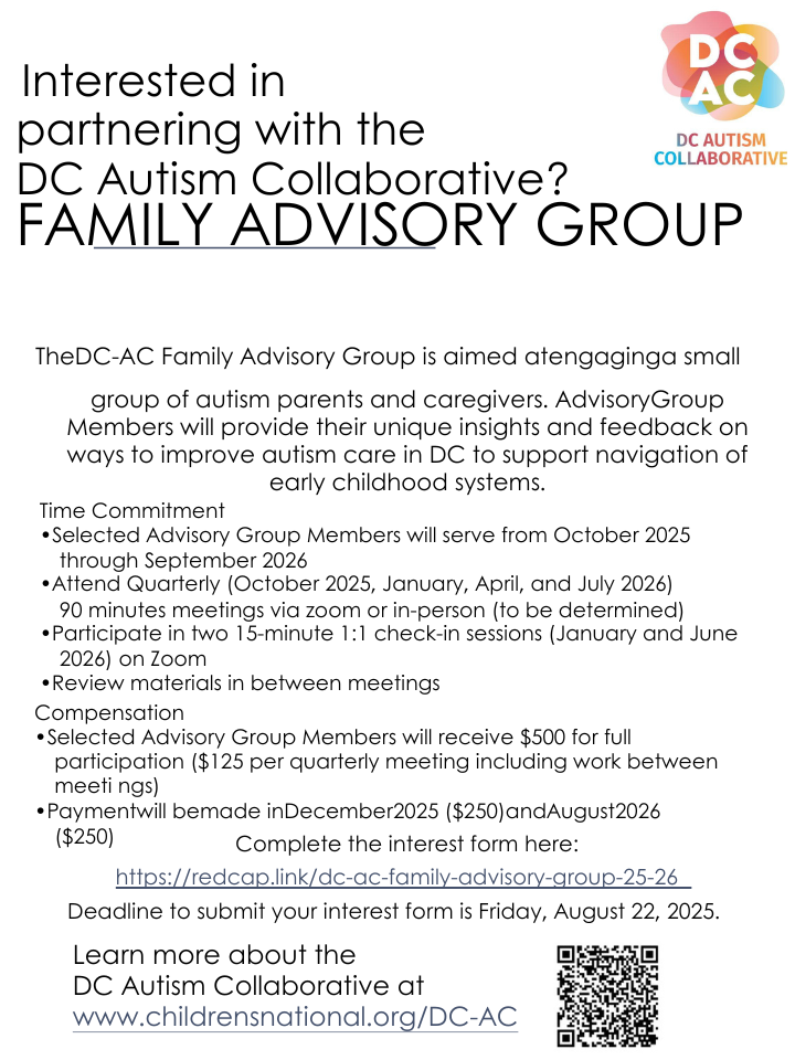 DC Autism Collaborative Family Advisory Group Recruitment0On August 4, 2025August 4, 2025By AJE-DCIn Blog, Custom, Events, NewsAJE would like to share with families that the DC Autism Collaborative (DC-AC) is recruiting parents and caregivers to serve on the 2025-2026 cohort of the Family Advisory Group. See the flyer below for more information!