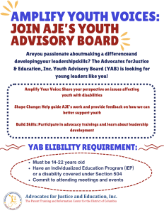 Young people ages 14–22, who are DC residents, are enrolled in school and have an IEP or qualify under Section 504 are eligible to become members of the YAB. For more information, please see this flyer, or contact youth@aje-dc.org. You can also apply today!