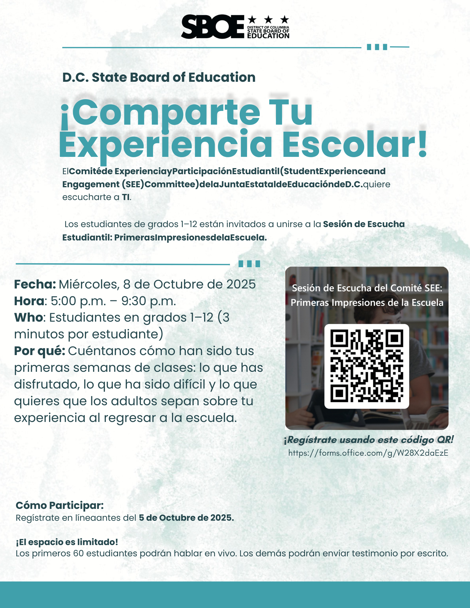 AJE desea compartir con nuestras familias que el Comité de Experiencia y Participación Estudiantil (SEE) de la Junta Estatal de Educación del Distrito de Columbia (D.C.) llevará a cabo su Sesión de Escucha Estudiantil: Primeras Impresiones de la Escuela, de 5 a 9:30 p. m. el miércoles 8 de octubre. Se invita a los estudiantes de 1.º a 12.º grado a asistir y compartir su experiencia de regreso a clases durante un máximo de tres minutos. ¿Qué ha ido bien? ¿Qué se puede mejorar en la escuela?