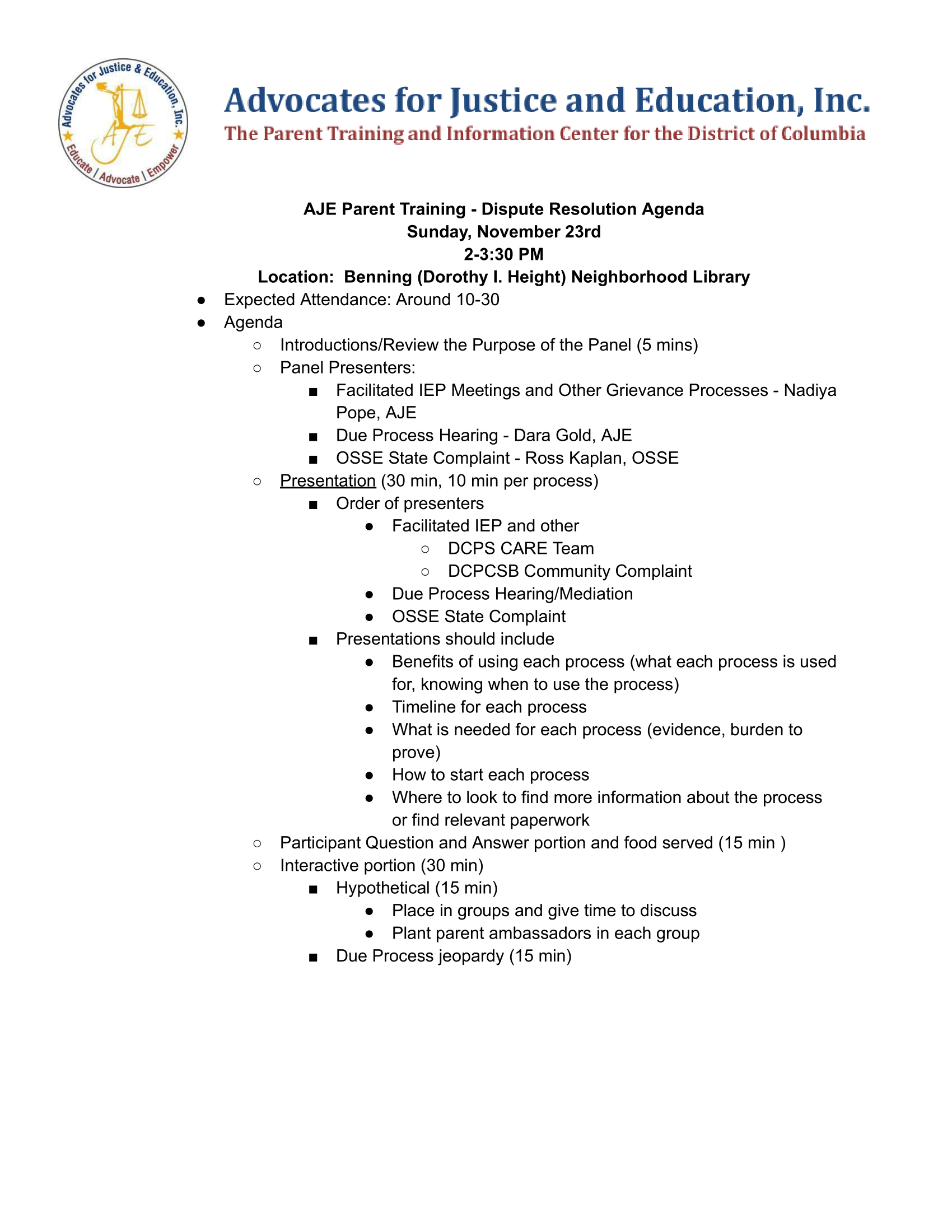 Event: Parent Training on Sunday, November 230On November 14, 2025November 14, 2025By AJE-DCIn Blog, EventsAJE is hosting Dispute Resolution training for parents on Sunday, November 23 from 2:00PM to 3:30PM at the Benning / Dorothy I. Height Neighborhood Library. Please see below for more details and an outline of the agenda!