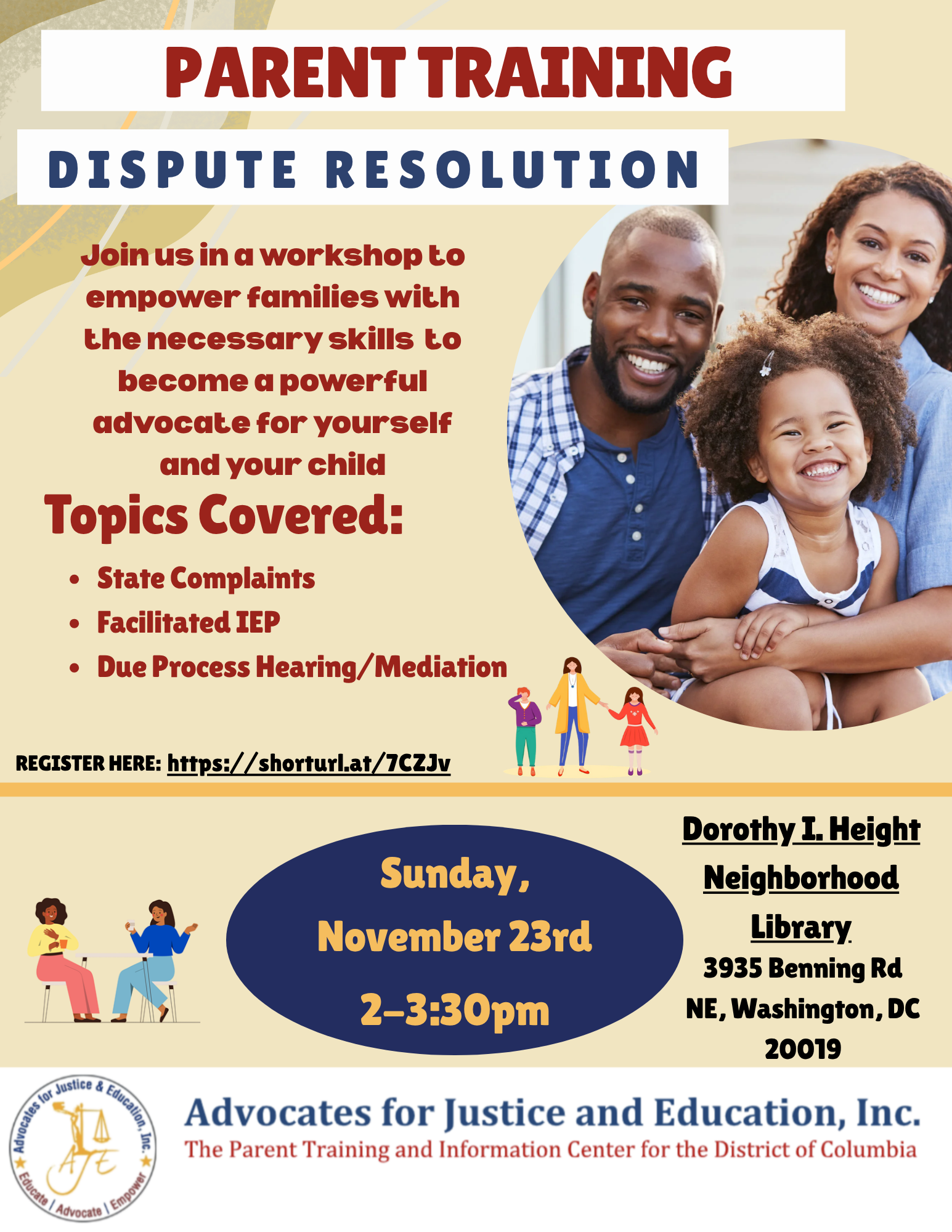 In person Parent Training on Dispute Resolution in the IDEA context November 23rd0On November 21, 2025November 14, 2025By AJE-DCIn Blog, Custom, Events, NewsAJE is excited to offer this Parent Training on Dispute Resolution in the IDEA context! You can register here & we look forward to seeing you on the 23rd! Don’t forget that the day before we also have a great Parent Cafe about school discipline!