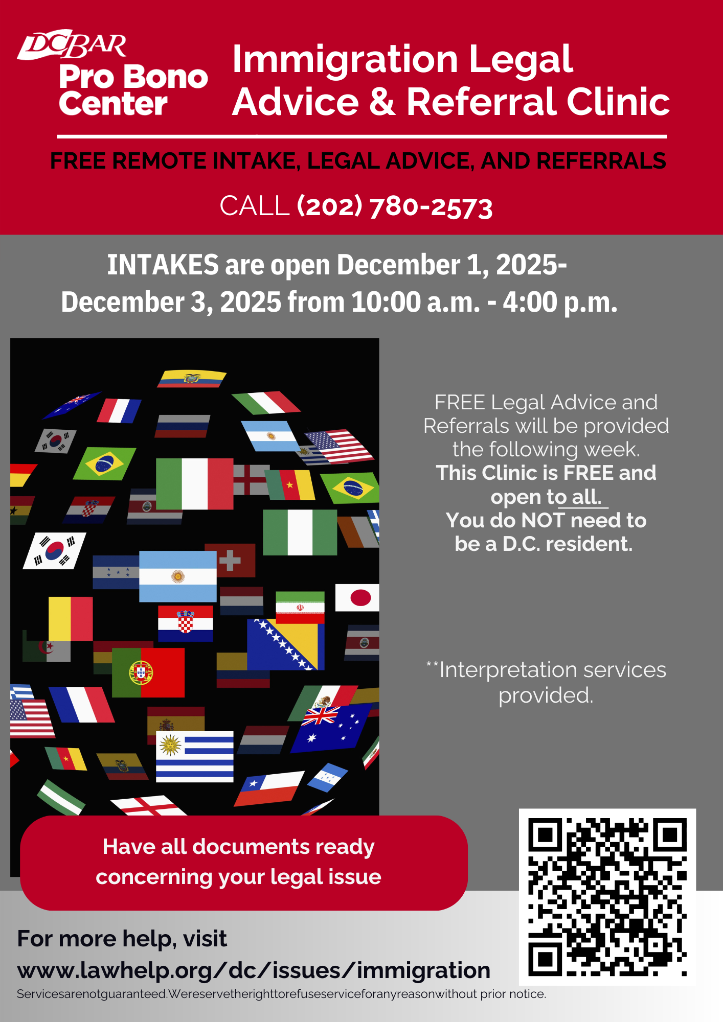 AJE would like to share with our families a FREE remote clinic for legal advice and referral clinic. The clinic is open to everyone and you do not need to be a D.C. Resident. Make sure to have all documents ready concerning your legal issue. Please see more information below: