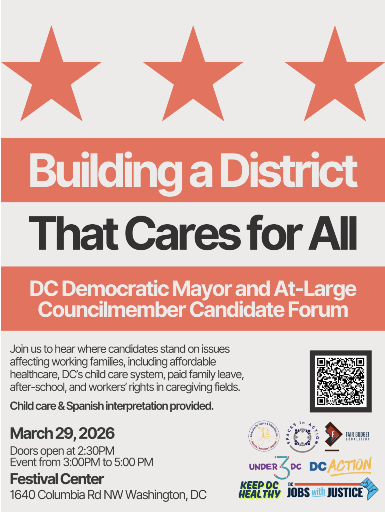 This event is sponsored by: Alliance for Justice and Education, Anti-Racist DC, DC Action, DC Fiscal Policy Institute, DC Jobs with Justice, Fair Budget Coalition, Festival Center, First Shift Justice Project, Jews United for Justice, Keep DC Healthy, Multicultural Spanish-Speaking Providers Association, National Domestic Workers Alliance, SPACEs In Action, and Under 3 DC.