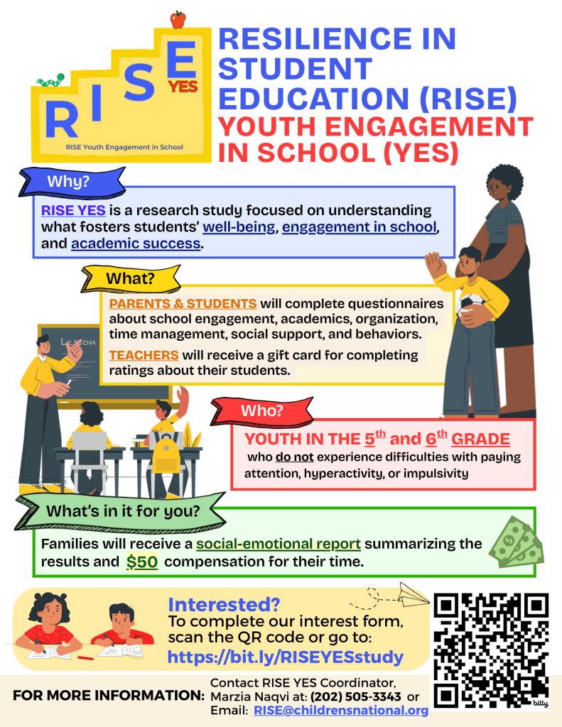 The Resilience in Student Education: Youth Engagement in School (RISE YES) project at Children’s National Hospital is conducting a remote study focused on understanding and promoting resilience among 5th and 6th grade students.