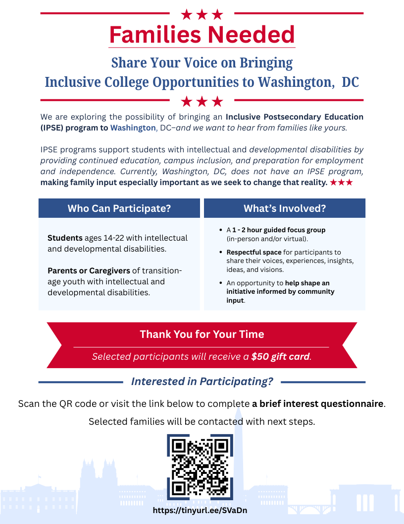 Family insight is critical to ensuring that any future IPSE program in our nation’s capital is person-centered and reflects students’ real needs and aspirations. Through this focus group, we aim to gather meaningful input to help shape an inclusive postsecondary and campus experience for students with intellectual and developmental disabilities, particularly those with moderate-to-complex support needs.